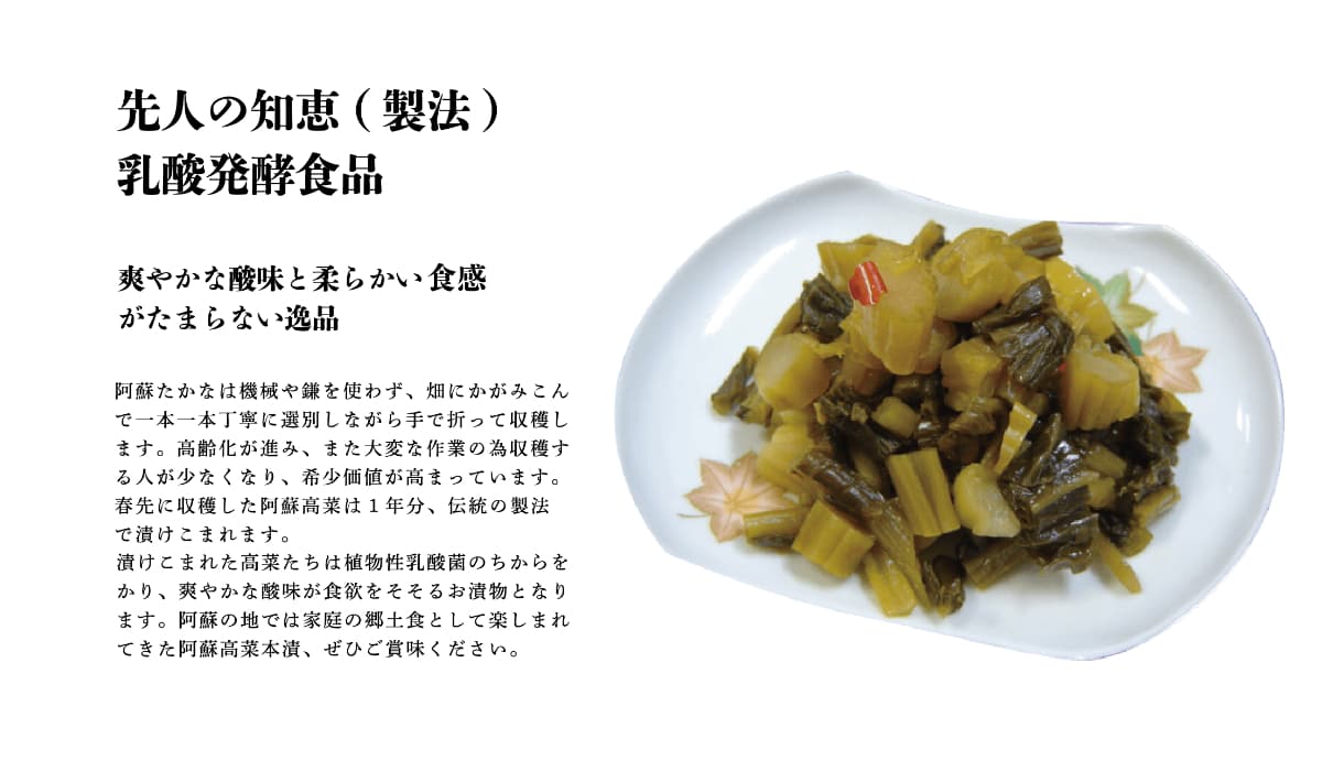 春先に収穫した阿蘇高菜は1年分、伝統の製法で漬けこまれます。漬けこまれた高菜たちは植物性乳酸菌のちからをかり、爽やかな酸味が食欲をそそるお漬物となります。阿蘇の地では家庭の郷土食として楽しまれてきた阿蘇高菜本漬、ぜひご賞味ください。