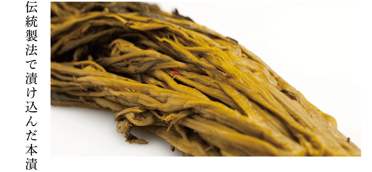 「姿もの」と呼ばれる刻んでいない本漬は、お好みの長さに切ってお召し上がりいただきます。5cmほどに切ってお茶請けとして食べたり、細かく刻んで醤油と鰹節をかけたり、色々な食べ方を試してみてください。