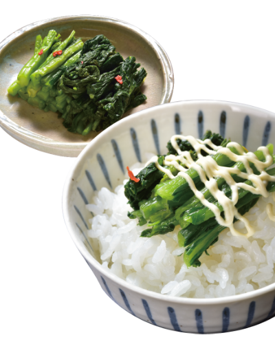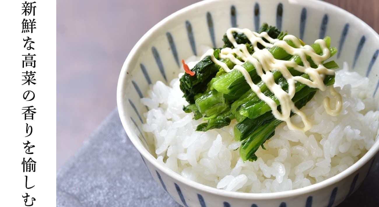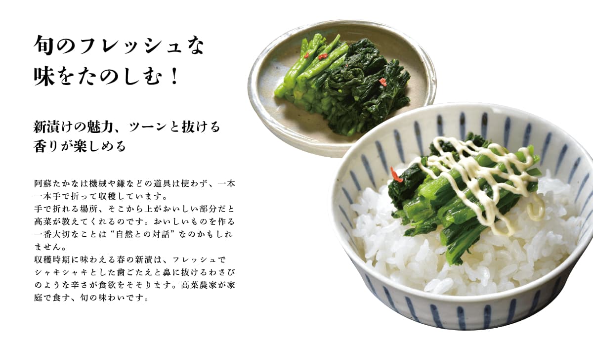 収穫時期に味わえる春の新漬は、フレッシュでシャキシャキとした歯ごたえと鼻に抜けるわさびのような辛さが食欲をそそります。高菜農家が家庭で食す、旬の味わいです。