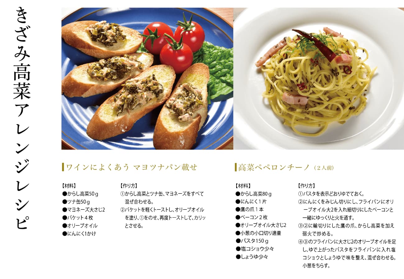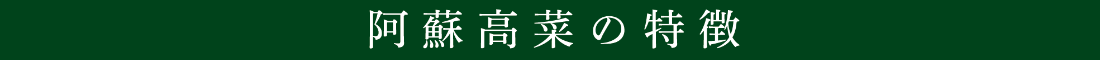 一般的に流通している「三池高菜」に比べ、阿蘇高菜は非常に手間がかかる方法で栽培・収穫されています。 阿蘇の厳しい寒さにさらされながら育つことで、農薬を使わずに育てることができ、 収穫には一つひとつ、手で折りながら収穫され、それが美味しい食感を生みます。